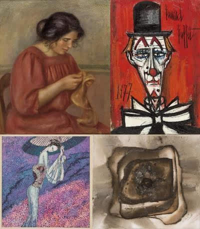 左上,法国印象画派代表代表的画家、雕刻家皮耶尔-奥古斯特-雷诺阿(RENOIR, Pierre-Auguste)的作品,落拍价约合1175万元人民币。右上,法国表现主义画派大师贝尔纳-布菲(BUFFET,Bernard)的作品,落拍价约合270万元人民币。左下,美籍华人画家,曾经开创云南画派的丁绍光的作品,落拍价约合33万元人民币。右下,北京奥运会开闭幕式的核心创意成员,中国国庆60周年焰火表演总导演蔡国强的作品,落拍价约合8万元人民币。