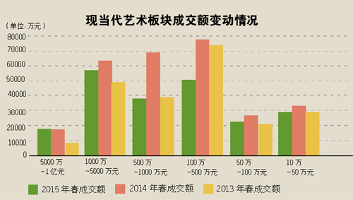 根据多位业内人士的市场判断,这是一个去泡沫化的阶段,市场正在向稳健经营、真实成交的行情发展。2015年春受国内经济增速放缓影响,现当代艺术板块成交惨淡,规模大幅缩减,呈同比下降趋势。
