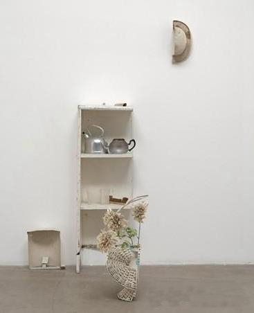 小野洋子,《半间屋》在纽约现代艺术博物馆展览上的细节。该装置包括多件切成一半的物件,几乎全数被漆成白色,展品均隶属一家私人收藏